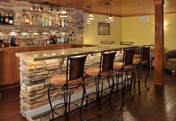 Want just the wet bar? Buy 10 linear feet of cabinets, a laminate countertop, a stainless steel drop-in bar sink and an under-counter refrigerator for about $2,500.