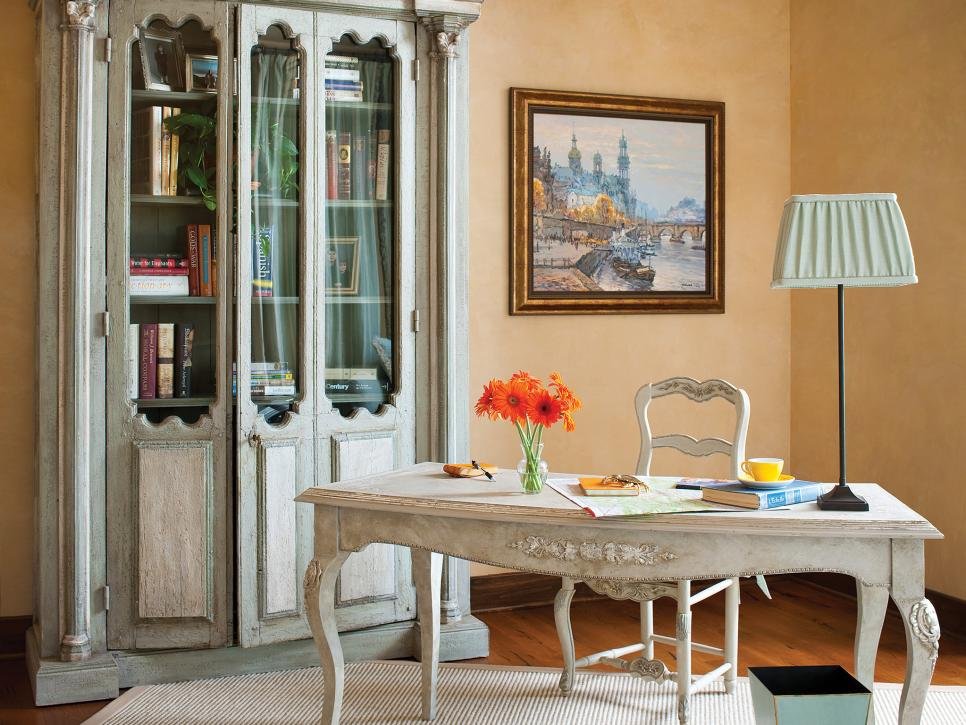 Add electric outlets for your computer and recessed lights. Kitchen cabinets or bookshelves organize the space above your desk. Put a rolling file cabinet underneath.